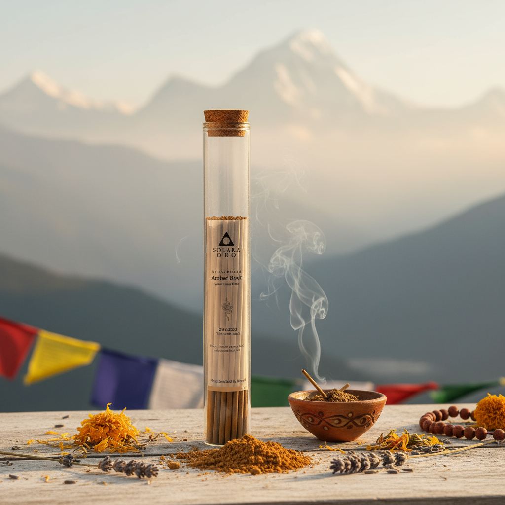 Handcrafted in Nepal and encased in a cork-sealed glass tube, Amber Root embodies timeless ritual with a modern, minimalist aesthetic.