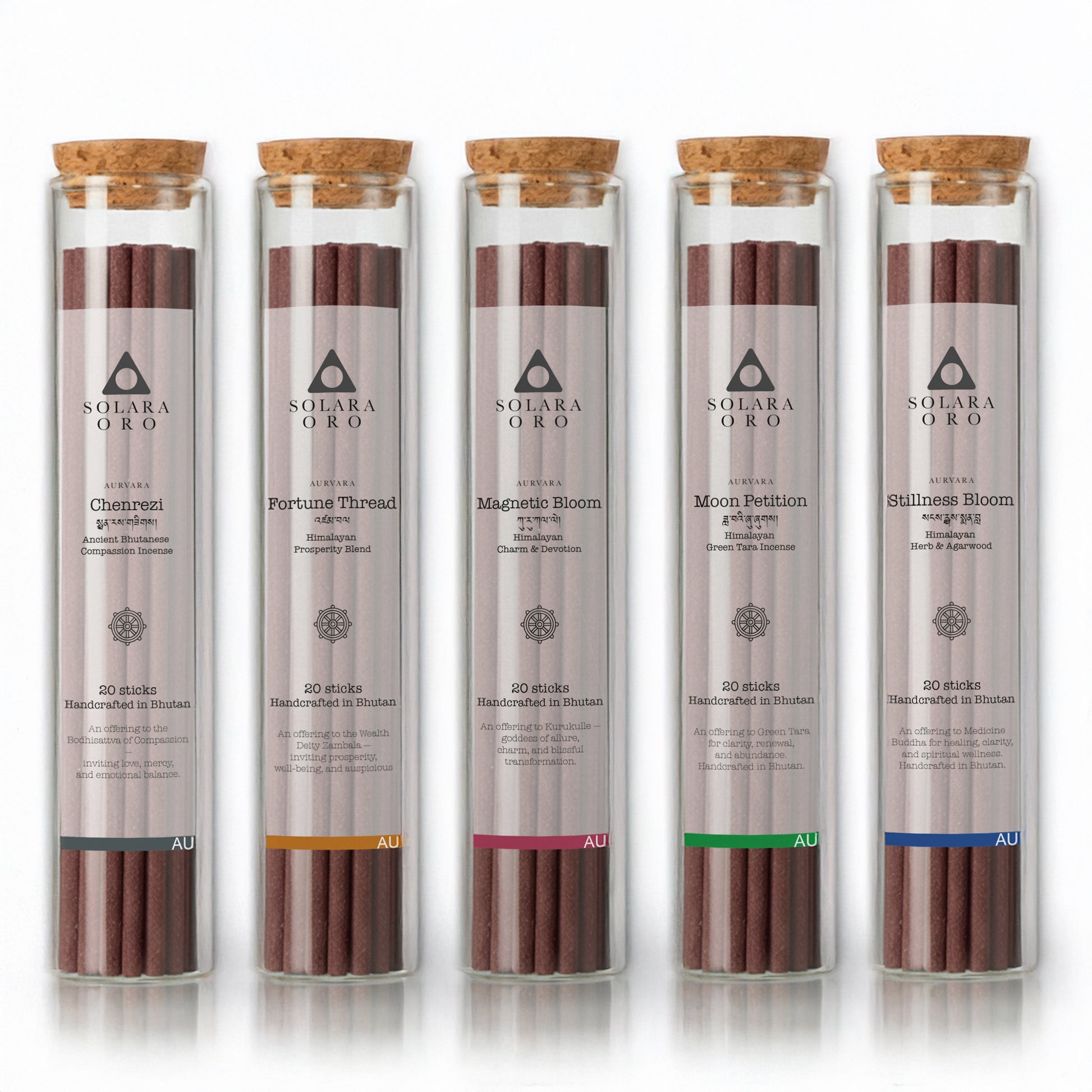 The AURVARA Set A brings together five sacred Bhutanese incenses that embody compassion, abundance, attraction, tranquility, and healing.
