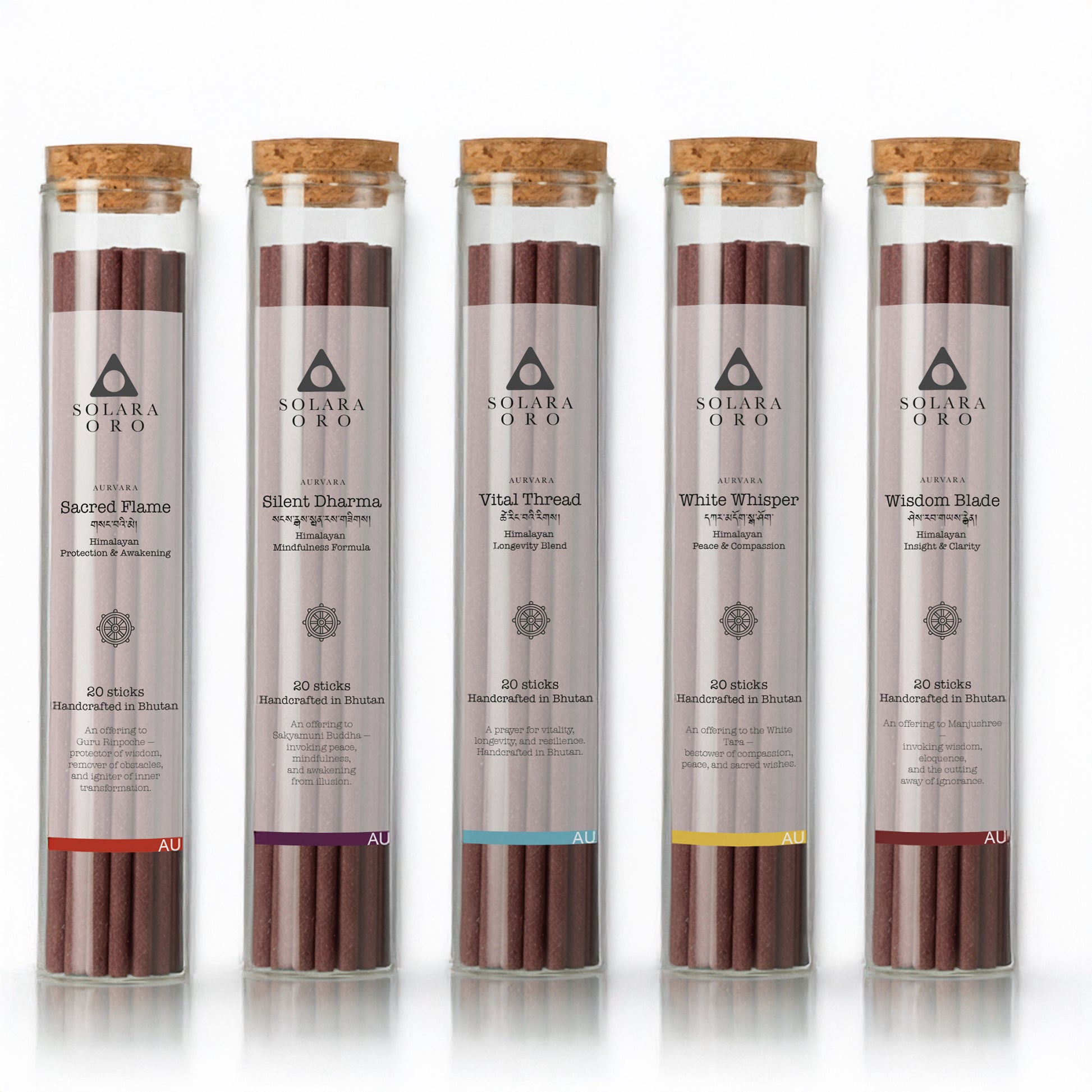 The AURVARA Set B gathers five sacred Bhutanese incenses that channel wisdom, purification, longevity, clarity, and purity.