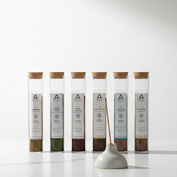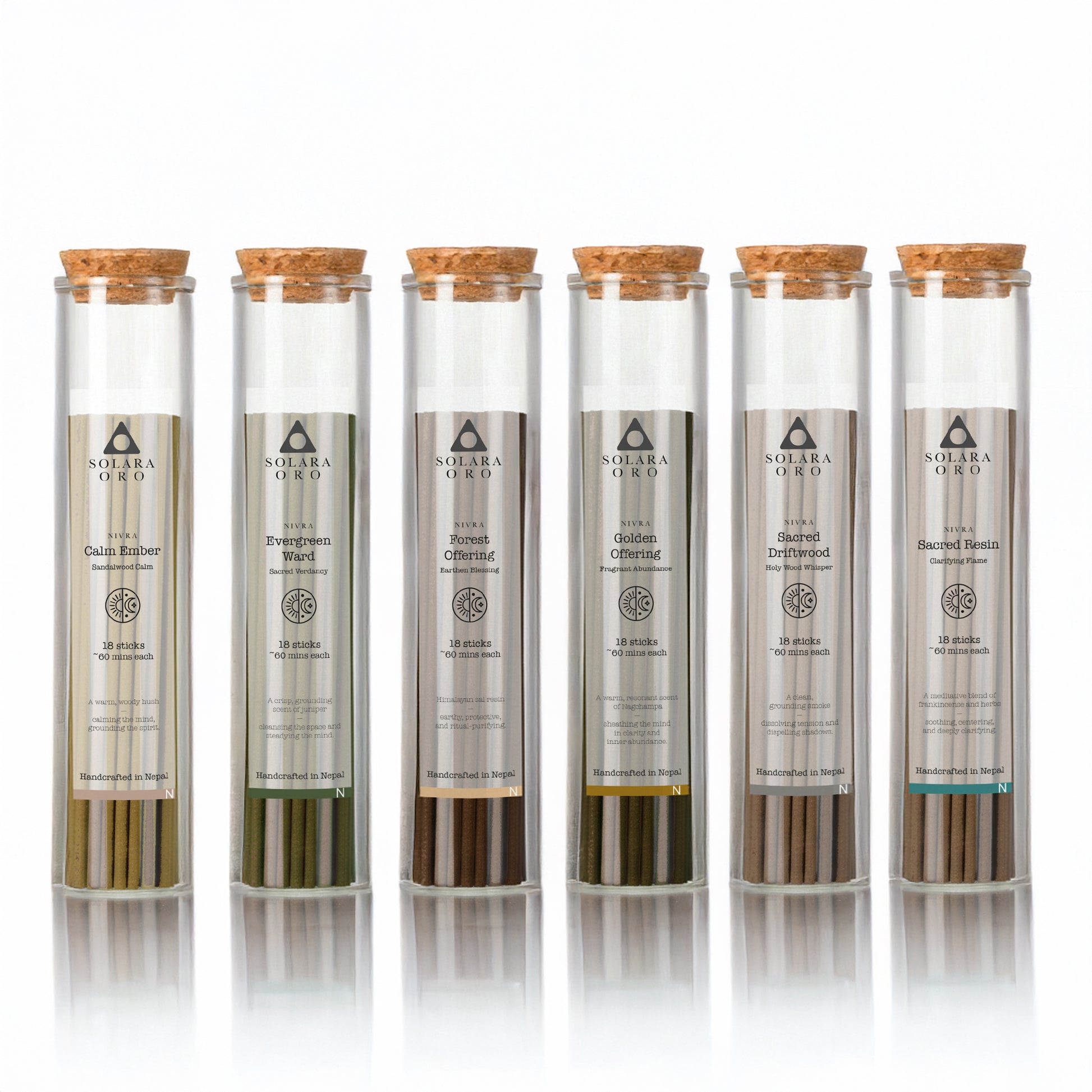 The NIVRA Collection Set A gathers six incense blends rooted in grounding, sacred presence, and ritual protection. From the warm depth of sandalwood to the purifying essence of resins and forest offerings, each stick anchors the spirit in steadiness and balance. Designed for those seeking sanctuary and stability, this set is a perfect companion for meditation, rituals, or evening stillness.