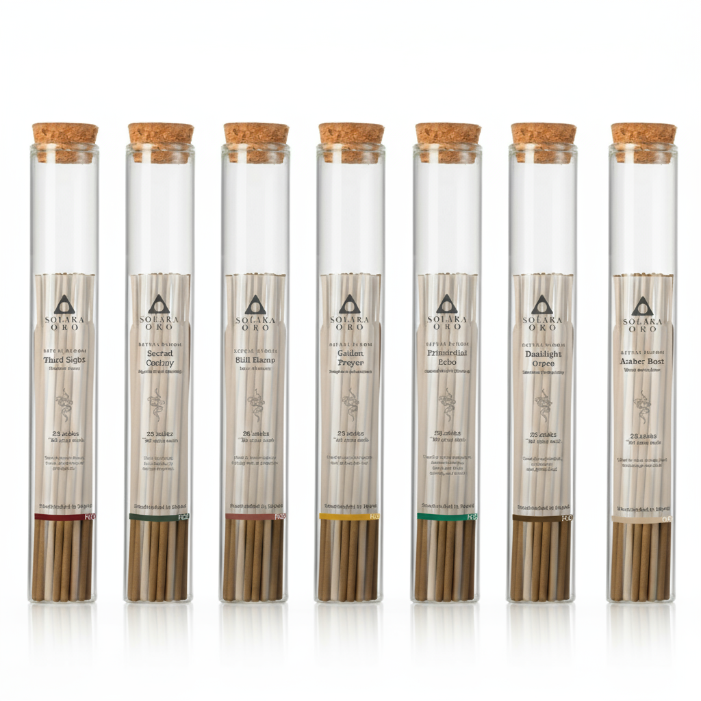 Encased in minimalist glass tubes with natural cork, the RITUAL BLOOM Collection reflects Solara Oro’s vision of sacred simplicity—modern, timeless, and designed to harmonize ritual with the present moment. Whether selected individually or as a complete set, these incense sticks make a thoughtful and meaningful gift.